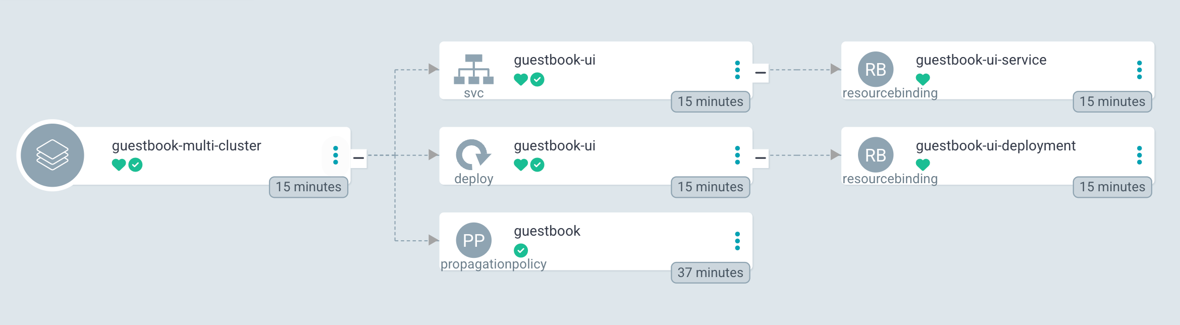 The svc/guestbook-ui, deploy/guestbook-ui and propagationpolicy/guestbook in the middle of the picture are the