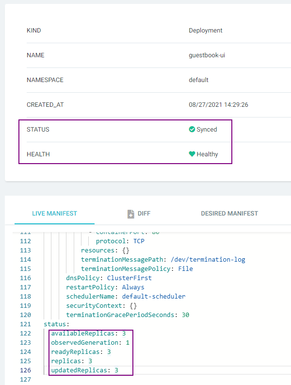 You can obtain the aggregated status of the Deployment from UI by deploy/guestbook-ui.