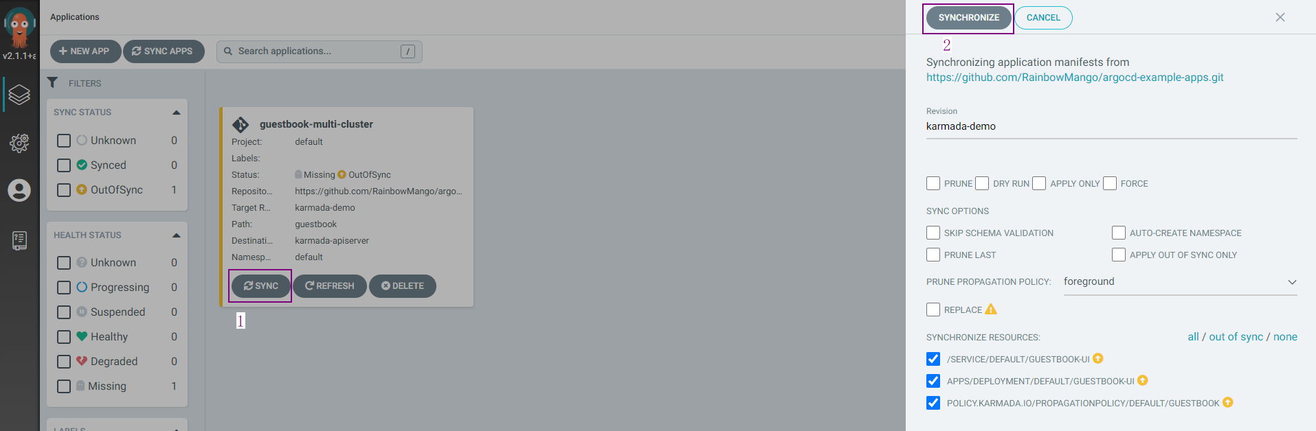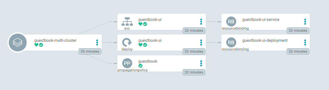 resourcebinding/guestbook-ui-deployment in the right of the picture are the resources created by Karmada.