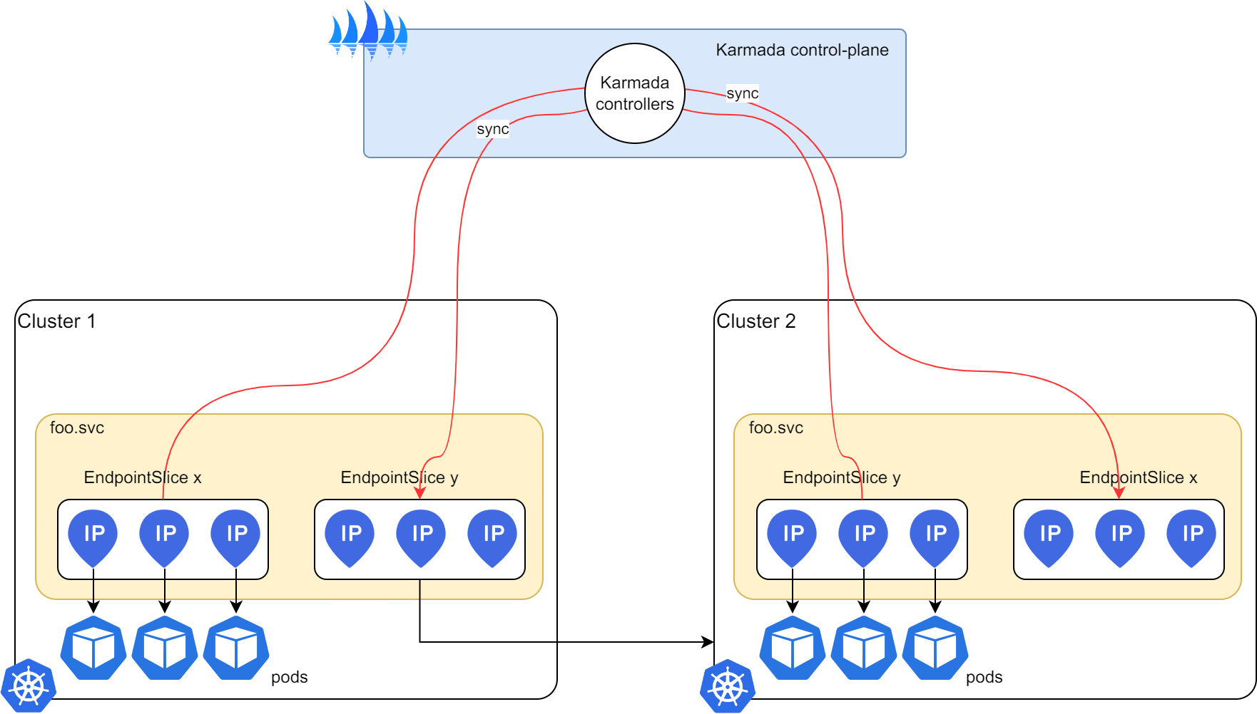 The MultiCluster Service is implemented as a Karmada API resource and multiple controllers, the resource determines the behavior of the controller. The multiple controllers, running within the Karmada control plane, sync the services' backend EndpointSlice resource between clusters, to add the multiple clusters' pods' IP to the services' backend.